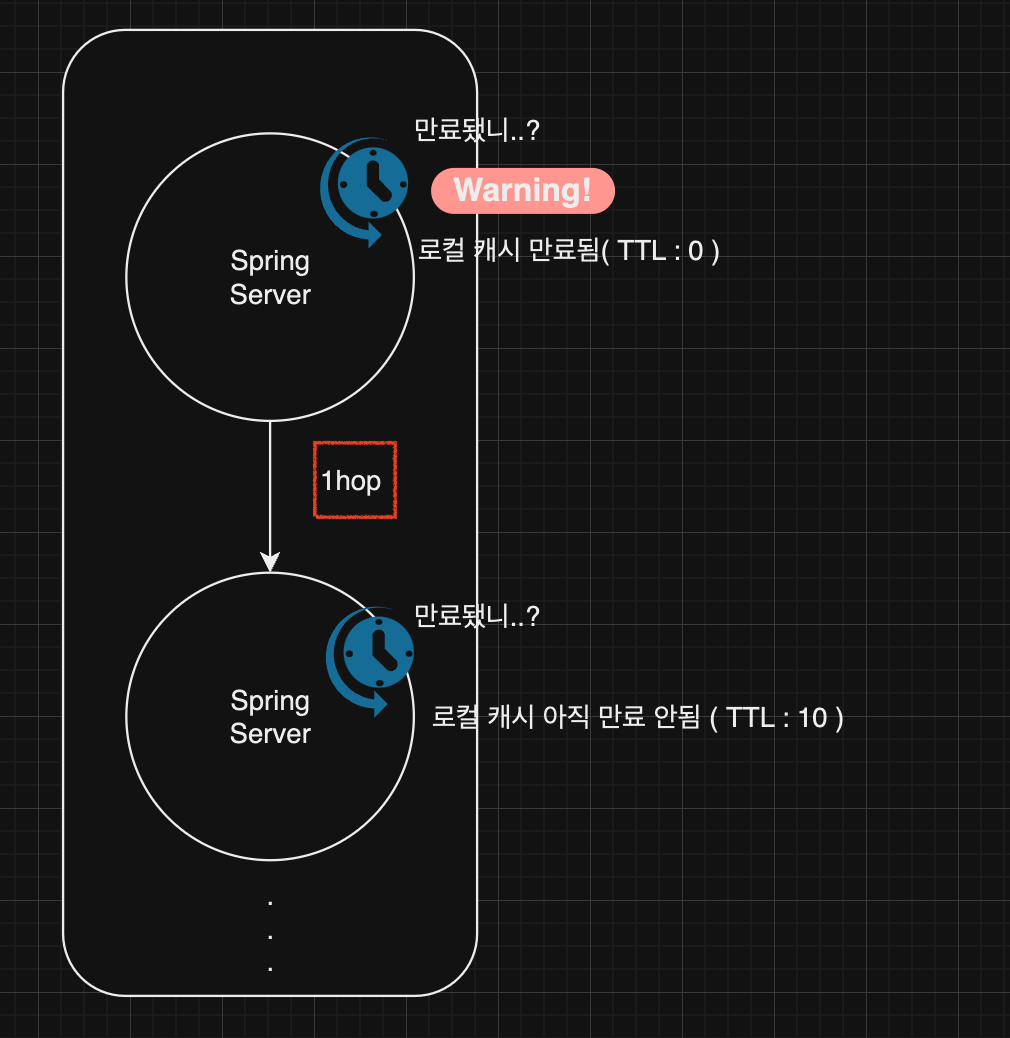 A 노드와 B 노드가 서로 다른 인스턴스에 위치하다 보니 서버 간 시간이 일치하지 않는 문제가 발생합니다. 이로 인해 A 노드에서는 캐시 미스가 발생해서 최신 데이터를 가져오지만, B 노드에서는 여전히 캐시 히트가 발생하며 이전 데이터를 반환하는 상황이 발생할 수 있습니다. 따라서 캐시의 동기화를 유지하기 위해 몇 가지 고려 사항이 있습니다.